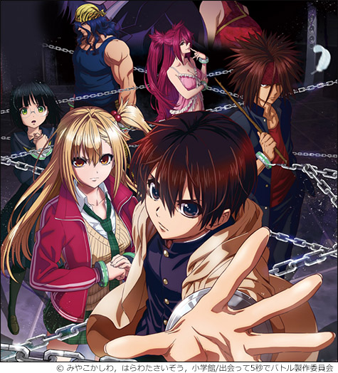 최근 각 메이저 출판사의 웹 만화 사이트 작품이 인기를 끄는 경우가 많아졌는데, 이 [만난 지 5초만에 배틀] 또한 쇼가쿠칸에서 운영하는 우라 선데이의 연재 만화가 원작입니다. SynergySP가 하청 중심이던 베가 엔터테인먼트와 공동으로 제작하는 이번 애니는 메인 스태프 경력조차 없는 무명의 연출가 나이토 메이고 씨가 총감독을 맡고, 역시나 무명인 아라이 노부요시 씨가 감독을 담당하는 등 스태프진은 시리즈 구성의 마치다 토우코 씨를 제외하면 상당히 마이너한 편인데, 그래도 일단 성우진에는 인기 성우를 다수 기용하고 있습니다.